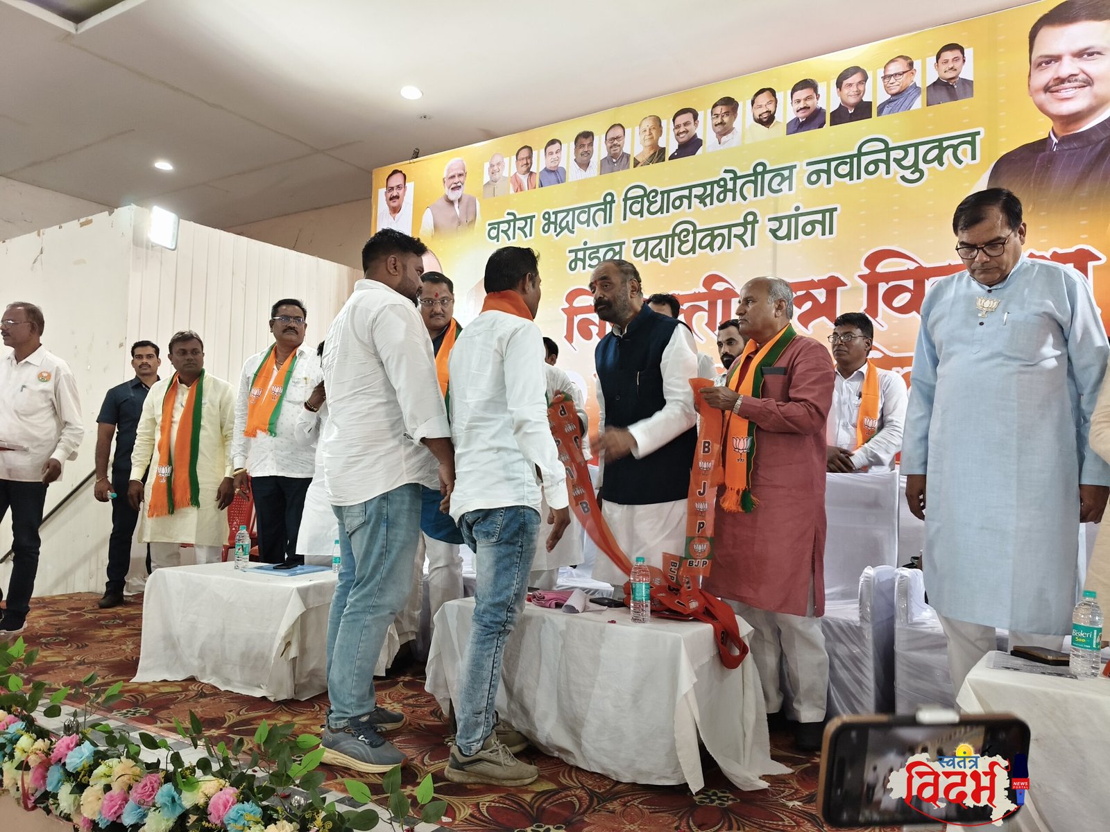 *वरोरा-भद्रावती विधानसभेतील नवनियुक्त मंडळ पदाधिकारी यांना नियुक्ती पत्र वितरण व कार्यकर्ता मेळावा संपन्न* आमदार करन देवतळे यांच्या नेतृत्वात विश्वास ठेवत इतर पक्षाच्या पदाधिकाऱ्यांचा मा. श्री हंसराजजी अहिर (अध्यक्ष, राष्ट्रीय मागासवर्गीय आयोग व माजी गृहराज्यमंत्री भारत सरकार), भाजपा विदर्भ संघटन मंत्री मा. श्री उपेंद्रजी कोठेकर, वरोरा विधानसभा आमदार मा. श्री करणजी देवतळे, चंद्रपूर जिल्हा मध्यवर्ती बँकेचे अध्यक्ष रवी भाऊ शिंदे, भाजपा जिल्हाध्यक्ष (ग्रामीण) मा. श्री हरीशजी शर्मा, रमेश जी राजुरकर निवडणूक प्रमुख वरोरा भद्रावती, व राज्य परिषद सदस्य भा. ज. पा यांच्या हस्ते भाजपमध्ये प्रवेश वरोरा-भद्रावती विधानसभा क्षेत्रातील नव्याने नियुक्त मंडळ पदाधिकाऱ्यांना नियुक्तिपत्र वितरण व कार्यकर्ता मेळावा हा कार्यक्रम वरोरा येथील सिद्धिविनायक मंगल कार्यालयात मोठ्या उत्साहात पार पडला. कार्यक्रमात मंडळ पदाधिकाऱ्यांना नियुक्तिपत्र वितरण करण्यात आले. त्यावेळी शिवसेना (उबाठा) शहरप्रमुख श्री खेमराजजी कुरेकार, उपशहरप्रमुख श्री संजयजी नरोले, गौरव बोबडे, शंकर गोवारदिपे, अमोल क्षीरसागर, शाखाप्रमुख अरुण ढाकणे, ज्ञानेश्वर पाटील, विठ्ठल खारकर, विठ्ठल उपरे, विलासभाऊ सपाटे व विनोद भाऊ मते, गोलु उर्फ प्रफुल जोशी तसेच इतर वरोरा भद्रावती तालुक्यातील अनेक पदाधिकाऱ्यांचा समावेश आहे. मंचावरील मान्यवरांनी नवप्रवेशित कार्यकर्त्यांचे भाजप परिवारात स्वागत करीत त्यांना शुभेच्छा दिल्या आणि पक्षविस्ताराच्या कार्यात सक्रिय सहभागाची अपेक्षा व्यक्त केली. 🙏 जय विदर्भ 🙏