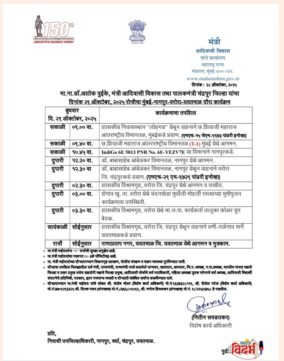 चंद्रपूर जिल्ह्याचे आदरणीय पालकमंत्री श्री अशोकजी वुईके साहेब हे दिनांक 29 ऑक्टोबर 2025 (बुधवार) रोजी मौजा भद्रावती येथे शेगाव–मुधोली–मोहर्ली मार्गाच्या भूमिपूजन कार्यक्रमासाठी उपस्थित राहणार आहेत.