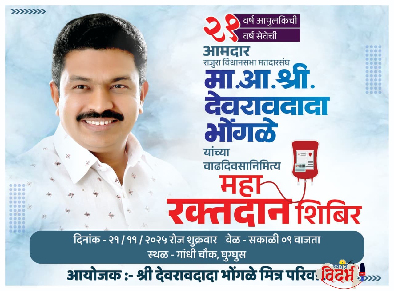 рд░рд╛рдЬреБрд░рд╛ рд╡рд┐рдзрд╛рдирд╕рднрд╛ рдорддрджрд╛рд░рд╕рдВрдШрд╛рдЪреЗ рд▓реЛрдХрдкреНрд░рд┐рдп рдЖрдорджрд╛рд░ рдорд╛. рд╢реНрд░реА. рджреЗрд╡рд░рд╛рд╡рджрд╛рджрд╛ рднреЛрдВрдЧрд│реЗ рдпрд╛рдВрдЪреНрдпрд╛ рд╡рд╛рдврджрд┐рд╡рд╕рд╛рдирд┐рдорд┐рддреНрдд тАЬрднрд╡реНрдп рд░рдХреНрддрджрд╛рди рд╢рд┐рдмрд┐рд░тАЭ рдЖрдпреЛрдЬрд┐рдд рдХрд░рдгреНрдпрд╛рдд рдЖрд▓реЗ рдЖрд╣реЗ.