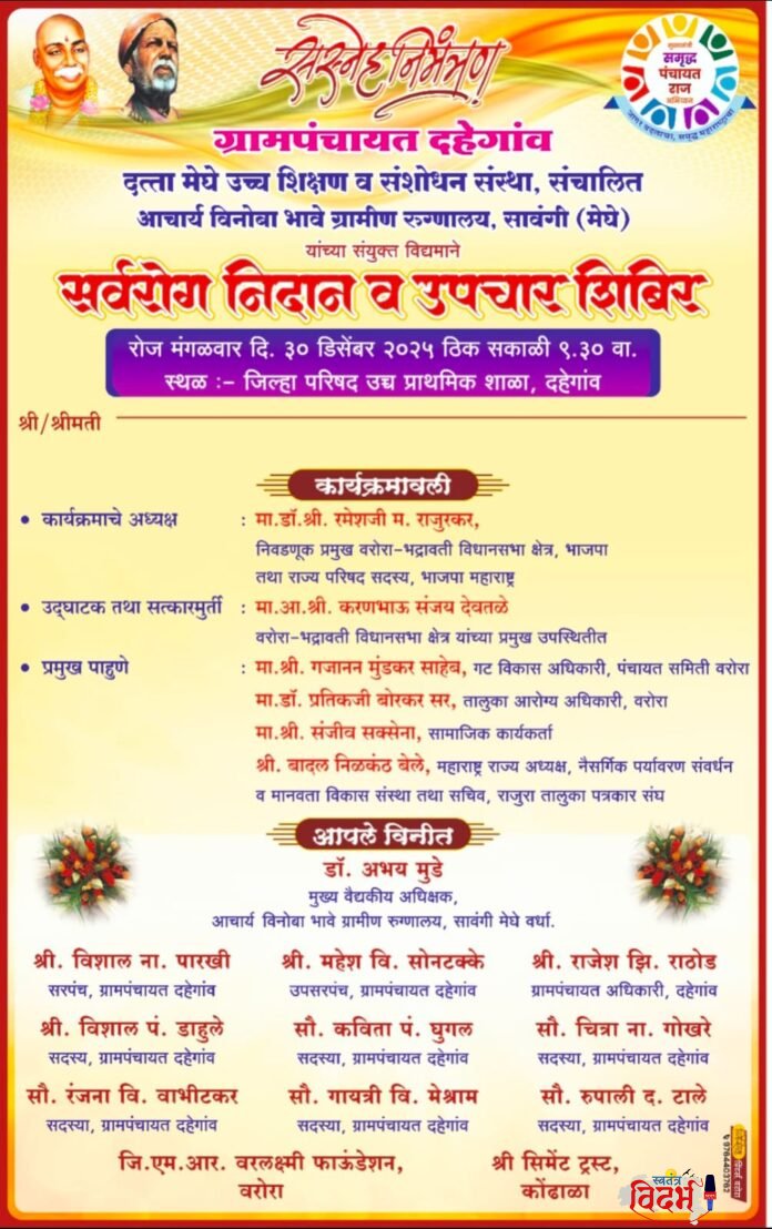 рджрд╣реЗрдЧрд╛рд╡ рдЧреНрд░рд╛рдореАрдг рднрд╛рдЧрд╛рддреАрд▓ рдЖрд░реЛрдЧреНрдпрд╕реЗрд╡реЗрд▓рд╛ рдирд╡реА рджрд┐рд╢рд╛ рджреЗрдгрд╛рд░рд╛ рдЖрдгрд┐ рд╕рд╛рдорд╛рдиреНрдп рдирд╛рдЧрд░рд┐рдХрд╛рдВрд╕рд╛рдареА рд╕рдВрдЬреАрд╡рдиреА рдард░рдгрд╛рд░рд╛ рднрд╡реНрдп рд╕рд░реНрд╡рд░реЛрдЧ рдирд┐рджрд╛рди рд╡ рдЙрдкрдЪрд╛рд░ рд╢рд┐рдмрд┐рд░рд╛рдЪрд╛ рджрдгрдХреНрдпрд╛рдд рд╢реБрднрд╛рд░рдВрдн рджрд╣реЗрдЧрд╛рд╡ рдпреЗрдереЗ рдкрд╛рд░ рдкрдбрдгрд╛рд░ рдЖрд╣реЗ. рдЧреНрд░рд╛рдордкрдВрдЪрд╛рдпрдд рджрд╣реЗрдЧрд╛рд╡, рдЗрддреНрддрд╛ рдореЗрдШреЗ рдЙрдЪреНрдЪ рд╢рд┐рдХреНрд╖рдг рд╡ рд╕рдВрд╢реЛрдзрди рд╕рдВрд╕реНрдерд╛ рд╕рдВрдЪрд▓рд┐рдд рдЖрдЪрд╛рд░реНрдп рд╡рд┐рдиреЛрдмрд╛ рднрд╛рд╡реЗ рдЧреНрд░рд╛рдореАрдг рд░реБрдЧреНрдгрд╛рд▓рдп, рд╕рд╛рд╡рдВрдЧреА (рдореЗрдШреЗ) рдпрд╛рдВрдЪреНрдпрд╛ рд╕рдВрдпреБрдХреНрдд рд╡рд┐рджреНрдпрдорд╛рдиреЗ рд╣рд╛ рдорд╣рддреНрддреНрд╡рд╛рдХрд╛рдВрдХреНрд╖реА рдЙрдкрдХреНрд░рдо рд░рд╛рдмрд╡рд┐рд▓рд╛ рдЬрд╛рдд рдЖрд╣реЗ.