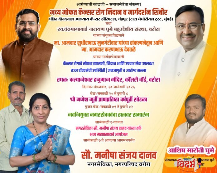 समाजाच्या आरोग्याची काळजी घेण्याच्या उदात्त हेतूने वरोरा येथे भव्य मोफत कॅन्सर रोग निदान व मार्गदर्शन शिबिराचे आयोजन करण्यात आले आहे. पंडित दीनदयाल उपाध्याय कॅन्सर हॉस्पिटल, चंद्रपूर (टाटा मेमोरियल ट्रस्ट, मुंबई) तसेच स्व. चंद्रभागाबाई नारायण घुमे बहुउद्देशीय संस्था, वरोरा यांच्या संयुक्त विद्यमाने हा उपक्रम राबविण्यात येत आहे.
