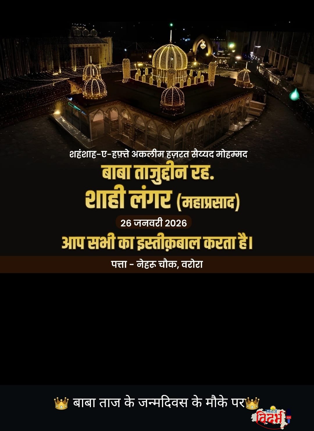 वरोरा के नेहरू चौक में हज़रत बाबा ताजुद्दीन बाबा का जनमदिन बडी धूमधाम से मनाई जाएगा 26 जनवरी के पावन अवसर पर महान सूफी संत, नागपुर के हज़रत ताजुद्दीन बाबा (जन्मोत्सव) श्रद्धा और अकीदत के साथ मनाया जायेगा.