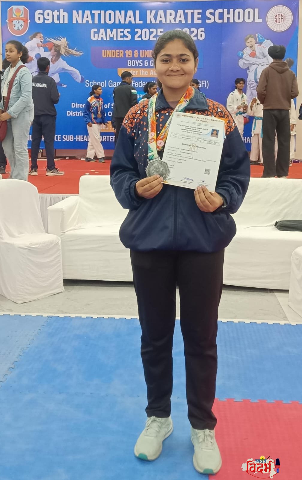 बारामती येथे नुकत्याच पार पडलेल्या ६९ व्या राष्ट्रीय कराटे शालेय क्रीडा स्पर्धा २०२५–२०२६ मध्ये वरोराच्या खेळाडूने पुन्हा एकदा आपली ताकद सिद्ध करत प्रतिस्पर्ध्यांना थेट आव्हान दिले. फौजी वॉरियर्स मार्शल आर्ट सेंटर, वरोरा तसेच आनंद निकेतन महाविद्यालय, वरोरा ची विद्यार्थीनी वेदिका गुणवंत भोयर हिने आपल्या जबरदस्त, आक्रमक आणि नेत्रदीपक खेळाच्या जोरावर द्वितीय क्रमांक पटकावत रजत पदकावर कब्जा केला.