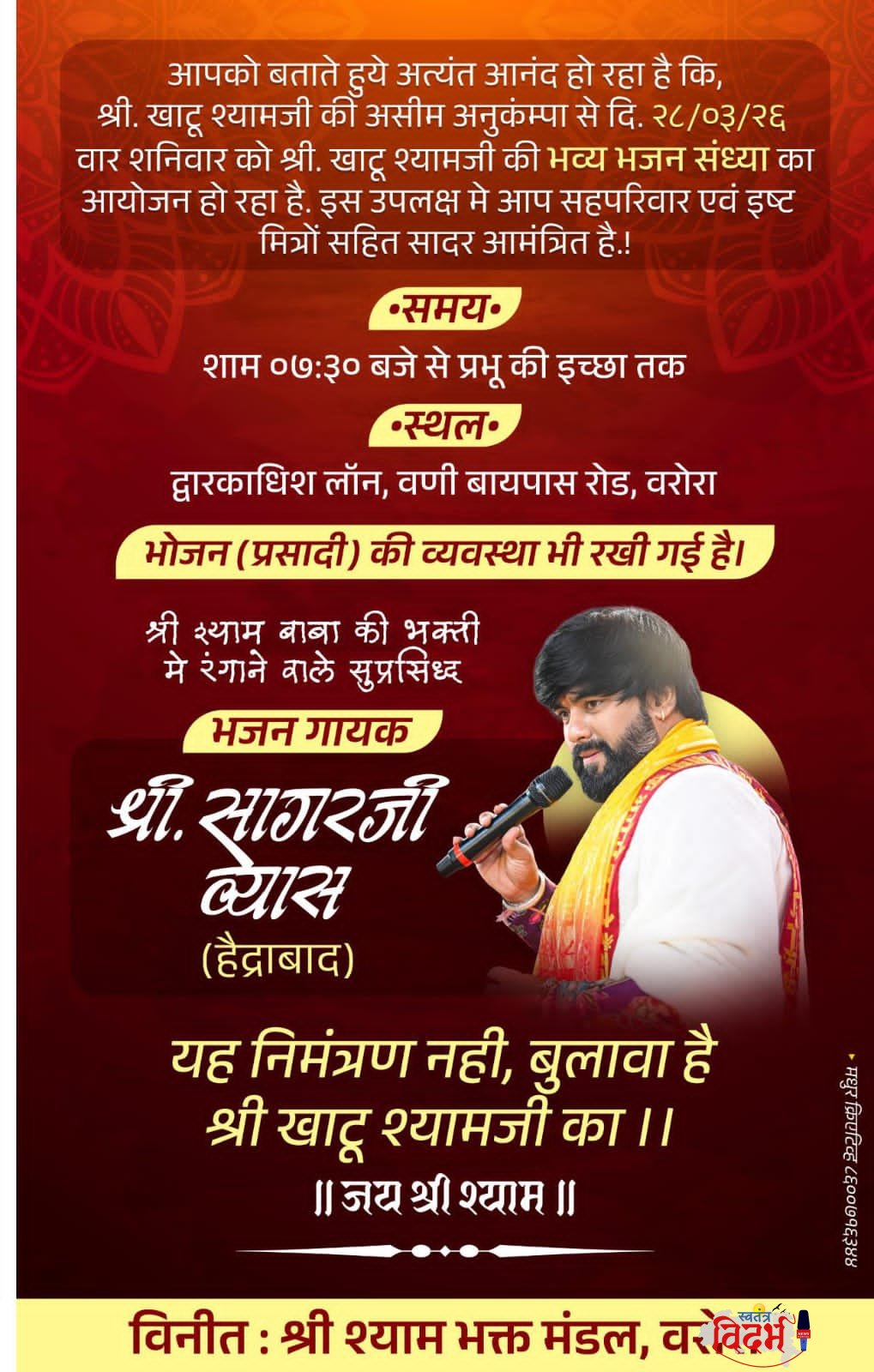 рд╡рд░реЛрд░рд╛: рднрд╛рд╡рд┐рдХрд╛рдВрдЪреЗ рд╢реНрд░рджреНрдзрд╛рд╕реНрдерд╛рди рдЕрд╕рд▓реЗрд▓реНрдпрд╛ рд╢реНрд░реА. рдЦрд╛рдЯреВ рд╢реНрдпрд╛рдордЬреАрдВрдЪреНрдпрд╛ рдЕрд╕реАрдо рдХреГрдкреЗрдиреЗ, рд╡рд░реЛрд░рд╛ рд╢рд╣рд░рд╛рдд рдПрдХрд╛ рднрд╡реНрдп ‘рднрдЬрди рд╕рдВрдзреНрдпрд╛’ рдХрд╛рд░реНрдпрдХреНрд░рдорд╛рдЪреЗ рдЖрдпреЛрдЬрди рдХрд░рдгреНрдпрд╛рдд рдЖрд▓реЗ рдЖрд╣реЗ. ‘рд╢реНрд░реА рд╢реНрдпрд╛рдо рднрдХреНрдд рдордВрдбрд│, рд╡рд░реЛрд░рд╛’ рдпрд╛рдВрдЪреНрдпрд╛ рд╡рддреАрдиреЗ рдЖрдпреЛрдЬрд┐рдд рдпрд╛ рднрдХреНрддреАрдордп рд╕реЛрд╣рд│реНрдпрд╛рд╕рд╛рдареА рд╕рд░реНрд╡ рднрд╛рд╡рд┐рдХрд╛рдВрдирд╛ рд╕рдкреНрд░реЗрдо рдирд┐рдордВрддреНрд░рдг рджреЗрдгреНрдпрд╛рдд рдЖрд▓реЗ рдЖрд╣реЗ.