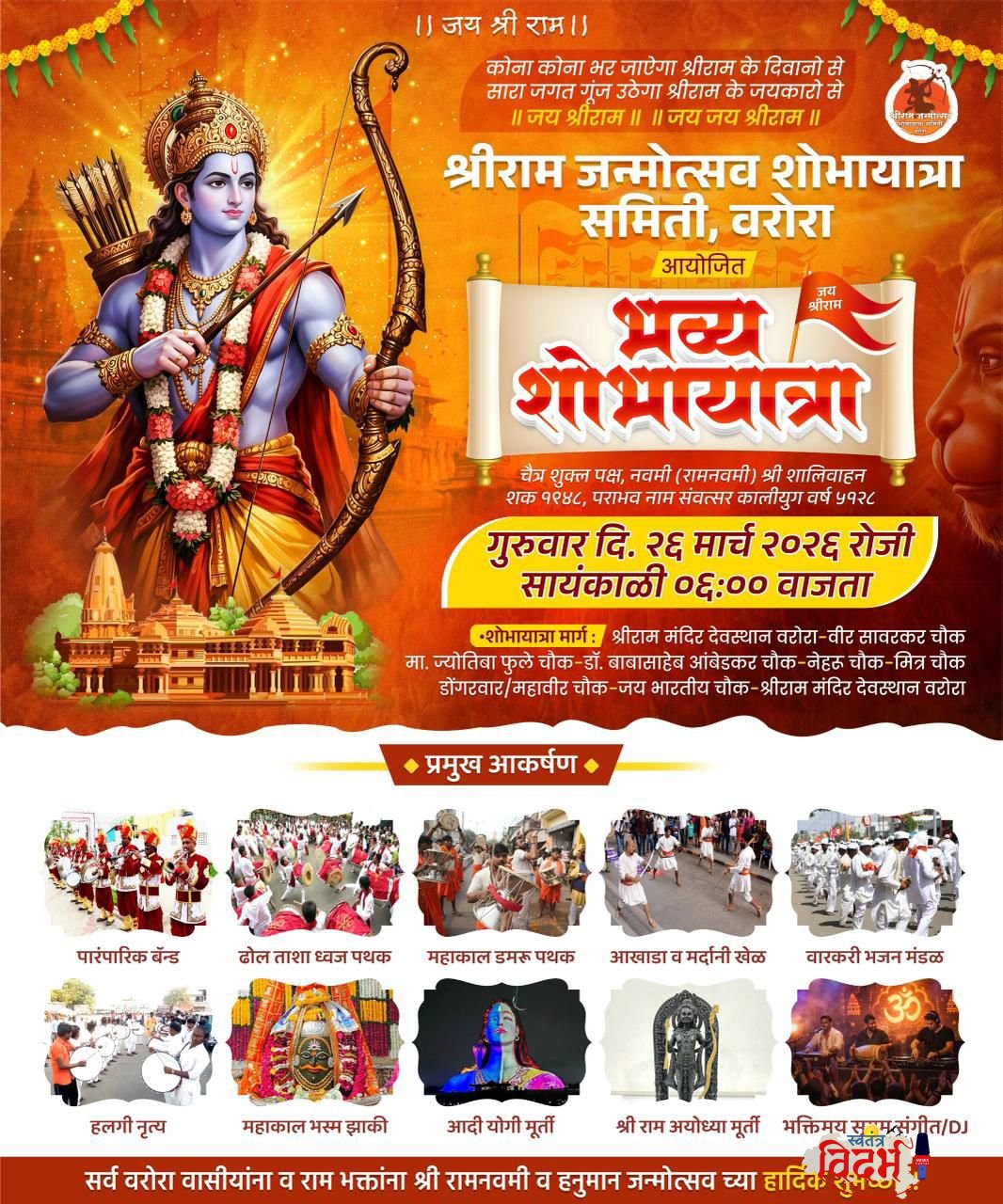 ‘कोना कोना भर जायेगा श्रीराम के दिवानो से, सारा जगत गूंज उठेगा श्रीराम के जयकारों से’ या भावनेने प्रेरित होऊन, श्रीराम जन्मोत्सव शोभायात्रा समिती, वरोरा यांच्या वतीने यावर्षी रामनवमीच्या पर्वावर एका भव्य शोभायात्रेचे आयोजन करण्यात आले आहे.