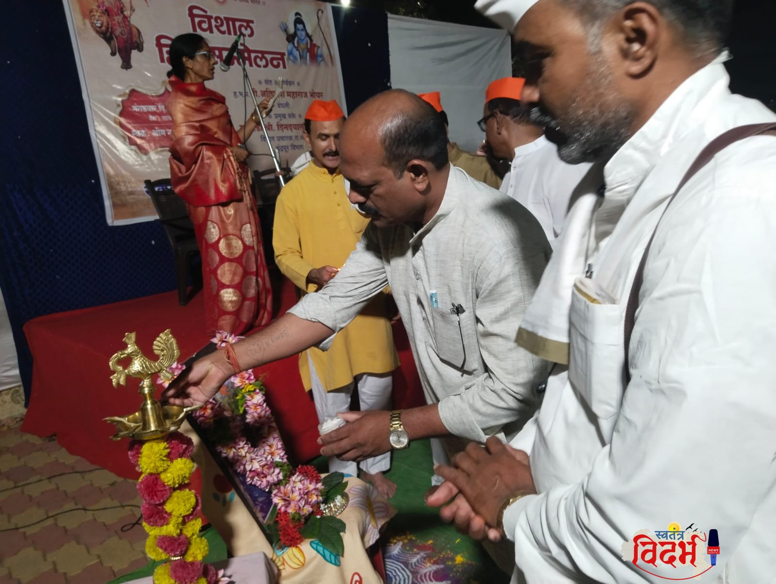 рджреАрдк рдкреНрд░рдЬреНрд╡рд▓рди, рднрд╛рд░рдд рдорд╛рддрд╛ рд╡ рдЧреЛрдорд╛рддрд╛ рдкреВрдЬрдирд╛рдиреЗ рд╣рд┐рдВрджреВ рд╕рдВрдореЗрд▓рдирд╛рд▓рд╛ рд╕реБрд░реБрд╡рд╛рдд рдЭрд╛рд▓реА. рдЬреНрдпреЛрддреА рдореЛрд╣рд┐рддрдХрд░ рдпрд╛рдВрдиреА рдХрд╛рд░реНрдпрдХреНрд░рдорд╛рдЪреЗ рд╕рдВрдЪрд╛рд▓рди рдХреЗрд▓реЗ. рд╢рдВрдХрд░ рдмреБрд░рдШрд╛рдЯреЗ рдпрд╛рдВрдиреА рдкреНрд░рд╛рд╕реНрддрд╛рд╡рд┐рдХ рд╡ рдкрд╛рд╣реБрдгреНрдпрд╛рдВрдЪрд╛ рдкрд░рд┐рдЪрдп рдХрд░реВрди рджрд┐рд▓рд╛. рдЛрд╖реА рдордбрд╛рд╡реА рдпрд╛рдВрдиреА рдЙрдкрд╕реНрдерд┐рддрд╛рдВрдЪреЗ рдЖрднрд╛рд░ рдорд╛рдирд▓реЗ.