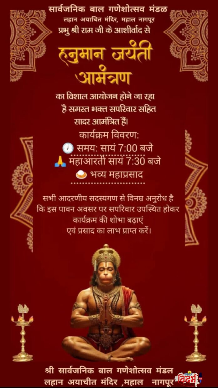 नागपूर:- येथील महालमधील लहान अयाचित मंदिर परिसरात असलेल्या *सार्वजनिक बाल गणेशोत्सव मंडळा’*च्या वतीने हनुमान जयंतीनिमित्त एका भव्य कार्यक्रमाचे आयोजन करण्यात आले आहे. प्रभू श्री रामांच्या आशीर्वादाने आयोजित या कार्यक्रमात विविध धार्मिक विधी पार पडणार आहेत.