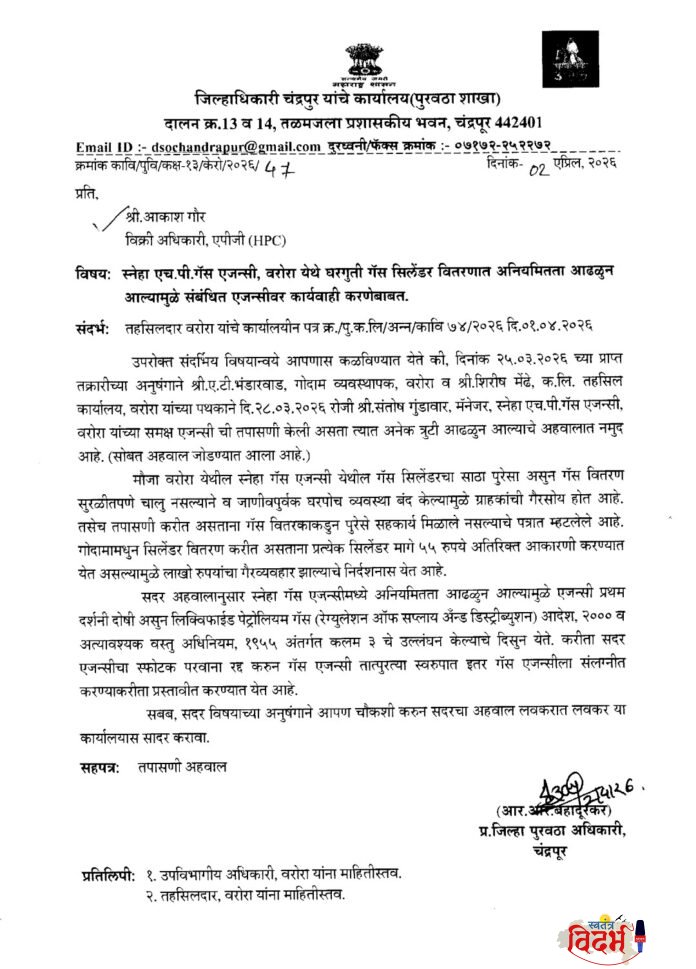 वरोरा येथील ‘स्नेहा एच.पी. गॅस एजन्सी’मध्ये घरगुती गॅस सिलिंडर वितरणात मोठ्या प्रमाणात अनियमितता आणि गैरव्यवहार होत असल्याचे उघडकीस आले आहे. याप्रकरणी जिल्हा पुरवठा अधिकारी यांनी कडक पावले उचलली असून, संबंधित एजन्सीचा स्फोटक परवाना रद्द करून ती इतर एजन्सीला संलग्न करण्याचा प्रस्ताव सादर केला आहे. यामुळे गॅस ग्राहकांची अडवणूक करणाऱ्या वितरकांचे धाबे दणाणले आहेत.