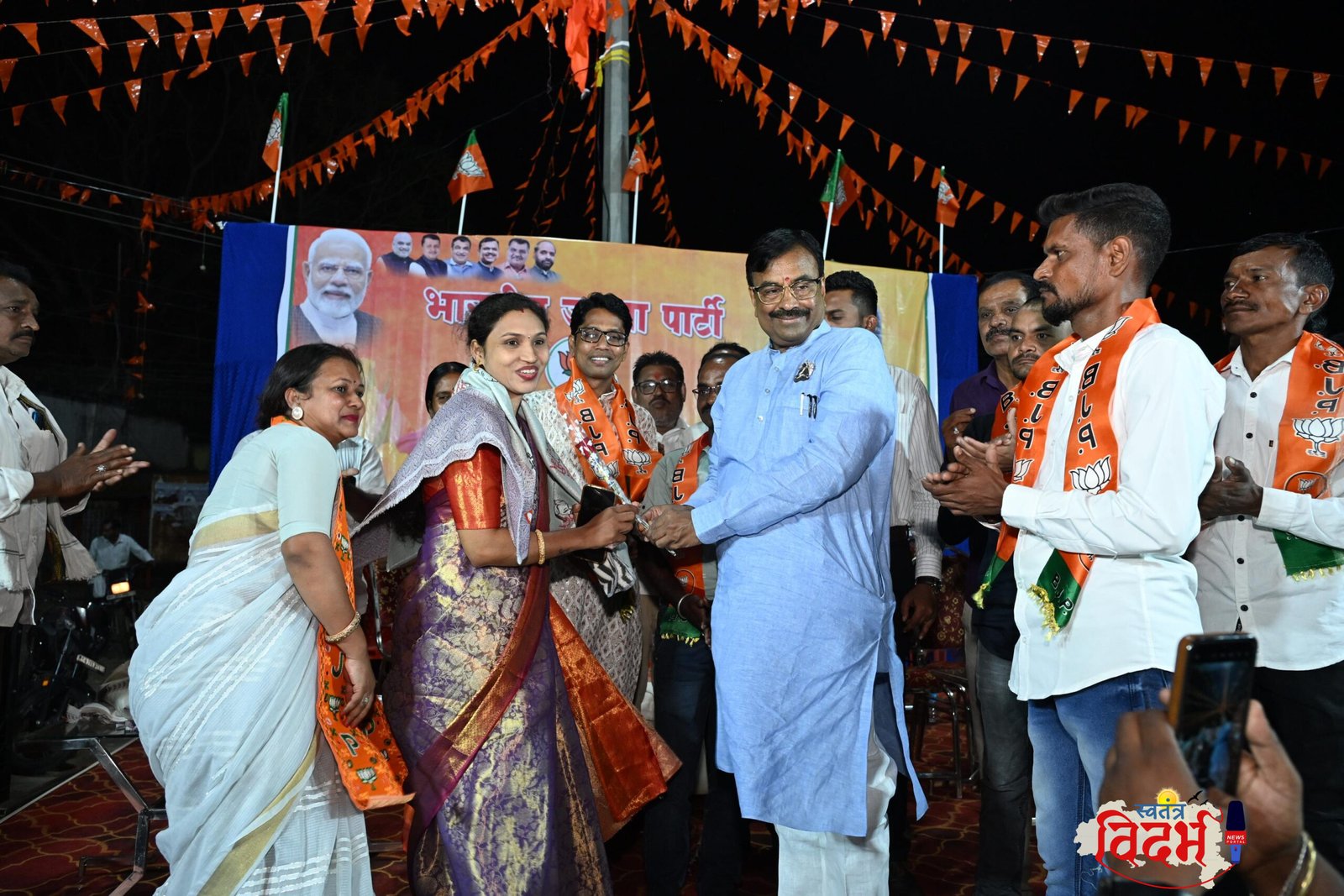 महाकाली कॉलनी, कॅन्टीन चौक येथे वाणीताई सदालावार यांच्या नेतृत्वात भाजपा पक्ष प्रवेश सोहळा आयोजित करण्यात आला. यावेळी विविध पदाधिकारी व कार्यकर्त्यांनी भारतीय जनता पार्टीमध्ये प्रवेश करत नव्या राजकीय प्रवासाची सुरुवात केली. कार्यक्रमाला माजी महानगर जिल्हाध्यक्ष राहुल पावडे, महामंत्री ब्रिजभूषण पाझारे, रामपाल सिंग, बीबी सिंग, श्री. तिवारी, ओमेश्वर नंदनवार, वीरेंद्रसिंग ठाकूर, मनीष सिंग, ब्रिजेश सिंग, विनोद यादव, महेश झिटे, सिंधुताई राजगुरे, सचिन कुकडे, अमित निरंजने आदींची प्रमुख उपस्थिती होती.यावेळी आ. सुधीर मुनगंटीवार यांनी नव्याने पक्षात प्रवेश करणाऱ्या सर्व कार्यकर्त्यांचे स्वागत केले. “भारतीय जनता पार्टी हा केवळ एक राजकीय पक्ष नसून सर्व समाजघटकांना सोबत घेऊन चालणारा ‘परिवार’ आहे,” असे त्यांनी सांगितले. विविध जाती-धर्मातील लोकांचा सहभाग असलेले चंद्रपूर व बल्लारपूर हे मतदारसंघ ‘छोटा भारत’ असल्याचे नमूद करत, सर्वसमावेशकतेच्या विचारावर भाजपाची वाटचाल असल्याचे त्यांनी स्पष्ट केले.आ. मुनगंटीवार पुढे म्हणाले, ‘भाजपाने कधीही दिशाभूल करणारे राजकारण केले नाही, तर विकासाच्या माध्यमातून लोकांचा विश्वास जिंकण्याचे काम केले आहे. कोणत्याही धर्म, जात किंवा समाजाचा नागरिक माझ्या कार्यालयात आला, तर त्याचे काम प्रामाणिकपणे केले जाते.’ अलीकडेच ईदनिमित्त मुस्लिम बांधवांसाठी खीर-कोरमा, साहित्य वाटप तसेच गरजू रुग्णांना नागपूर येथील एम्स रुग्णालयात उपचारासाठी मदत देण्याचे कार्य करण्यात आल्याचे त्यांनी सांगितले.