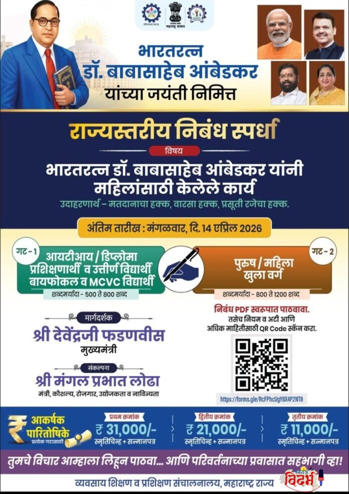भारतरत्न डॉ. बाबासाहेब आंबेडकर यांच्या जयंतीचे औचित्य साधून महाराष्ट्र राज्य व्यवसाय शिक्षण व प्रशिक्षण संचालनालयामार्फत एका विशेष राज्यस्तरीय निबंध स्पर्धेचे आयोजन करण्यात आले आहे. या स्पर्धेचा मुख्य विषय ‘भारतरत्न डॉ. बाबासाहेब आंबेडकर यांनी महिलांसाठी केलेले कार्य’ असा असून, राज्यातील जास्तीत जास्त नागरिकांनी यात सहभागी व्हावे, असे आवाहन करण्यात आले आहे.